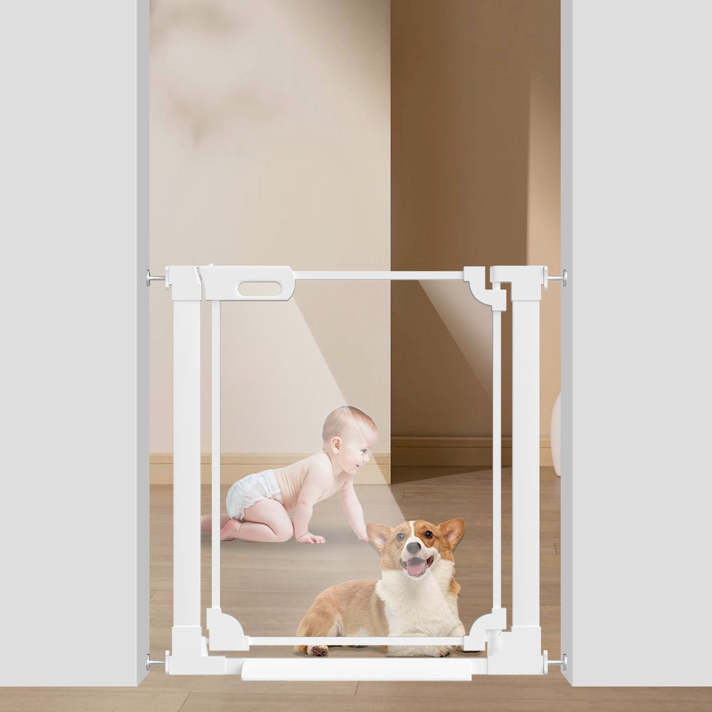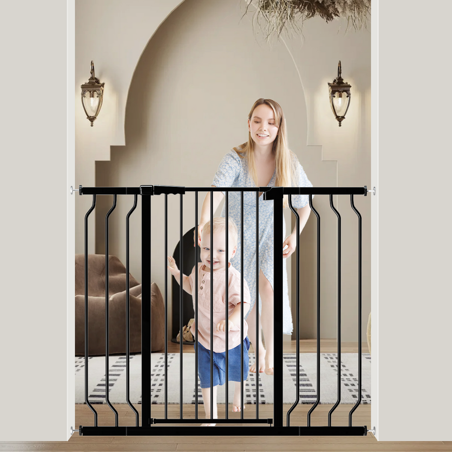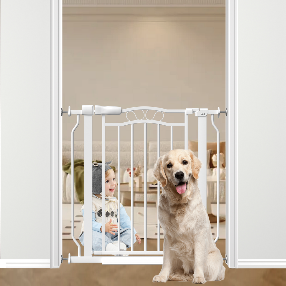 The gate features a 23.5-inch Wide Swing Door, offering 20% more space than other gates for improved convenience. Its design allows it to stay open at angles over 90 degrees, providing convenient access. Additionally, it automatically closes and locks if the door is open less than 90 degrees, offering double security.